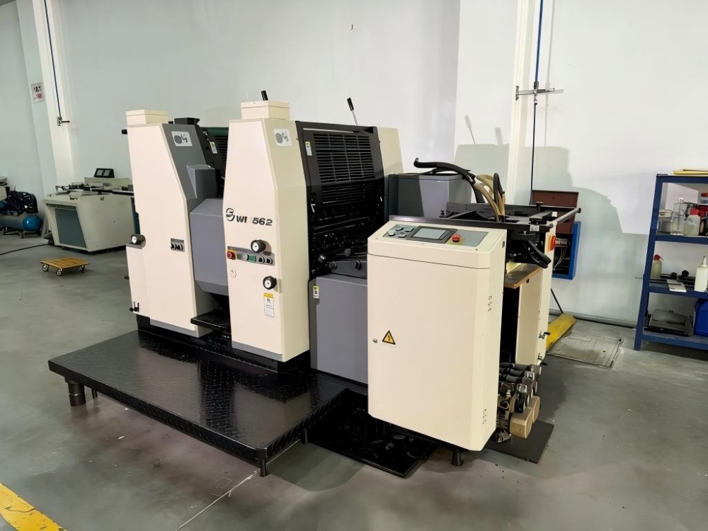 Il s'agit de la presse d'impression offset d'impression d'étiquettes bicolores A2. Il est destiné aux petites et moyennes séries de production. Tout est question d’efficacité et de simplicité d’utilisation. Il peut imprimer deux couleurs en un seul passage papier. Cela permet d'économiser du temps et du travail. Il dispose d'un dispositif de positionnement et de tension rapide pour le montage sur plaque. Cela réduit le temps de changement. Il existe également un système de nettoyage semi-automatique des rouleaux encreurs, qui accélère les changements de couleur et allège la charge de travail de l'opérateur. La presse dispose d'un système d'alimentation continue en papier. Il est associé à une table d’aspiration sous vide et à trois tapis de transport rotatifs. Cette configuration gère bien différentes épaisseurs de papier. Les pinces à double ressort empêchent le papier de glisser. C’est la clé de l’impression à grande vitesse. Il possède également des fonctionnalités pratiques. Des choses comme le mouillage de l’alcool et le réglage automatique du volume d’eau. Il dispose également d'une distribution de papier de qualité avec des buses d'air et des roues d'aspiration.