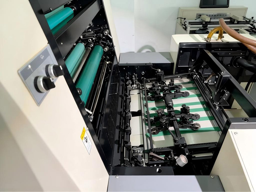 6) Les mécanismes de transport du papier tels que la tête d'alimentation du papier, la table à papier, le guide avant et les pinces à papier garantissent que la presse peut imprimer sur une large gamme de papiers, du papier épais au papier fin.